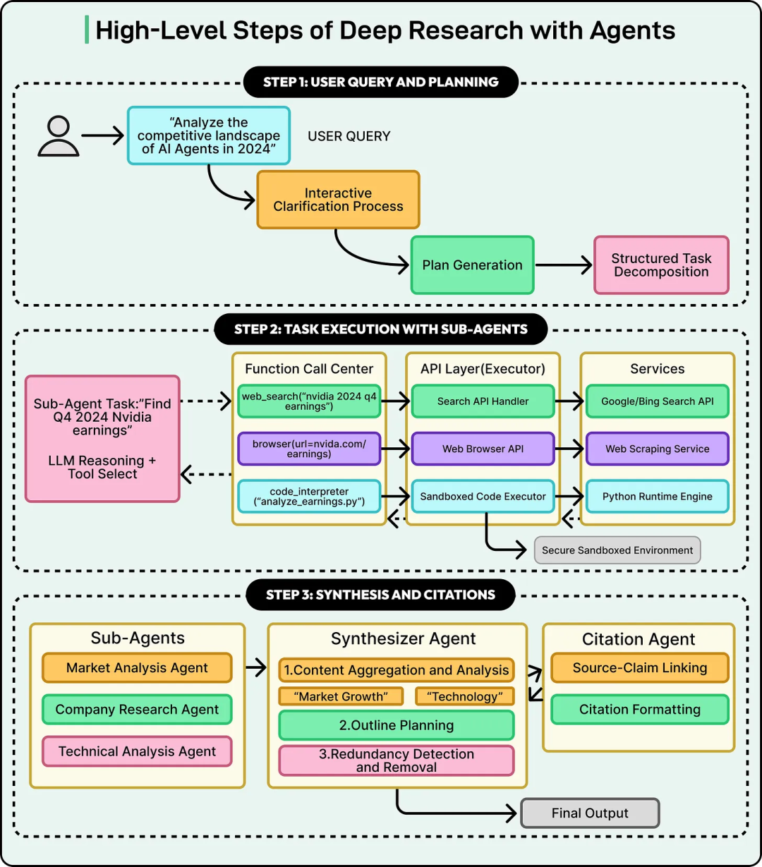 综合代理会把网页代理返回的所有内容整合为最终研究报告:它将信息组织成不同章节,处理重复与重叠内容,并构建连贯的叙事结构。引用代理随后会通读综合后的报告,确保每个陈述都有正确来源支撑,并把引用插入到正文的正确位置,使最终报告能够被底层材料充分“背书”。