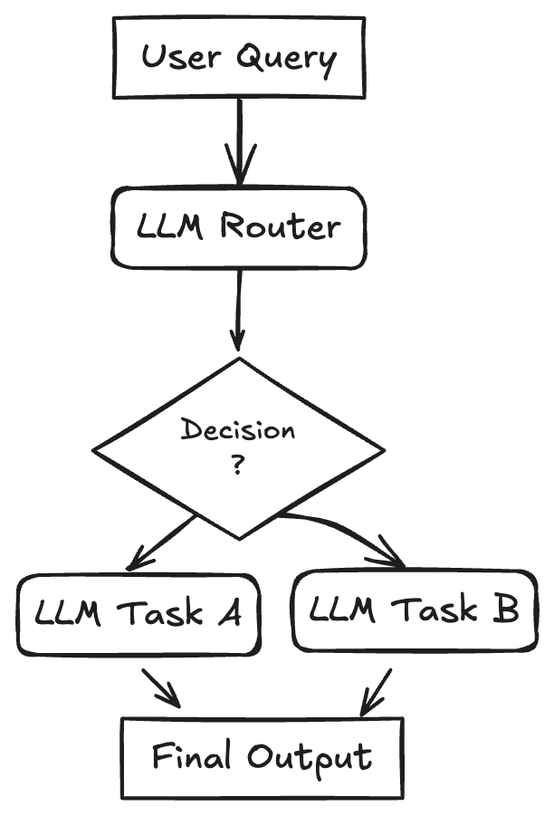 由初始大语言模型充当路由器,对用户输入进行分类后,将其分发至最适合的专项任务或大语言模型。该模式实现了职责分离,允许单独优化各个下游任务(如使用专用提示词、不同模型或特定工具),提高了效率。对于简单任务,可调用更小的模型,从而降低成本。任务被分发后,由选中的智能体负责完成后续工作。