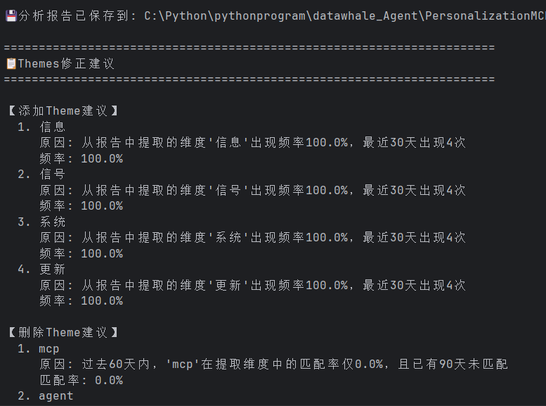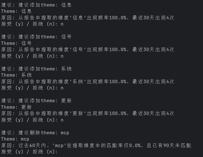 系统会将提取的维度与现有的 YouTube 搜索主题(themes.yaml) 进行对比,自动生成 添加 或 删除 主题的修正建议。这些建议会帮助用户 优化 他们的搜索主题,以便获取更相关的内容。