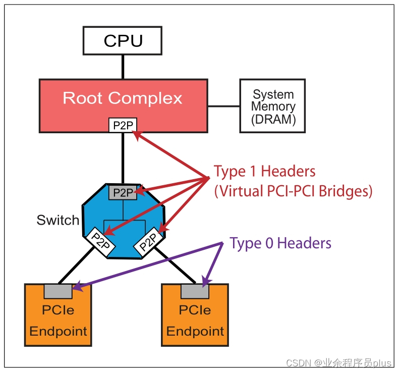 在一个PCIe总线中,Type 0配置空间头和Type 1配置空间头如下图所示。