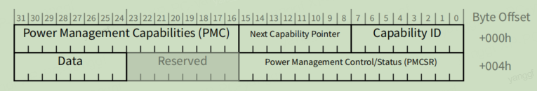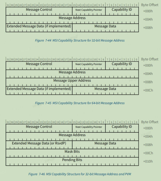 - 40h-FFh(192字节)是PCI/PCI-X和PCIe扩展的配置空间,主要存放一些与MSI或者MSI-X中断机制和电源管理相关的Capability Structures。支持中断的PCI、PCI-X、PCIe设备(桥)必须支持40h-FFh的配置空间。