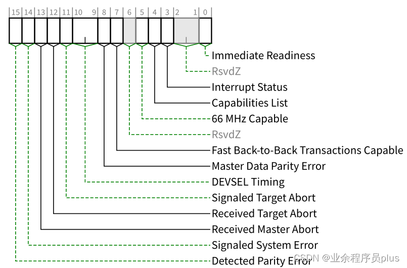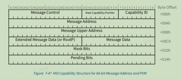 Pending Bits - 存放 MSI 中断 Pending 状态位。 当 Function 触发中断请求后,相应的 bit 会被置为 1。 仅当 Function 支持 Per-Vector Masking(即 Message Control.bit8 为 1)时实现,否则该寄存器为保留位(RsvdP)。 |
