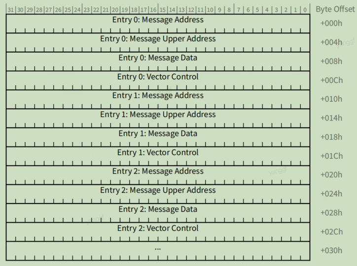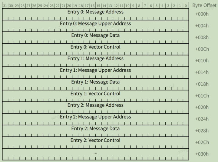 MSI-X Table如下图所示。每一个Entry表示一个MSI-X中断向量,占用16字节。一个Entry由4部分组成,分别是Message Address、Message Upper Address、Message Data、Vector Control。