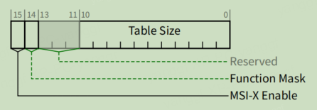 系统软件读取该字段以确定 MSI-X Table 的大小 N,其编码为 N–1。 例如返回值为 |