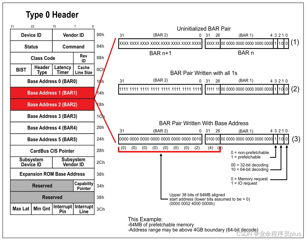 - 0-3Fh(64字节)是PCI兼容配置空间头,按类型可分为Type 0配置空间头和Type 1配置空间头。PCIe设备使用Type 0配置空间头,PCIe桥使用Type 1配置空间头。所有的PCI、PCI-X、PCIe设备(桥)必须支持64字节的配置空间头,即00h-40h。
