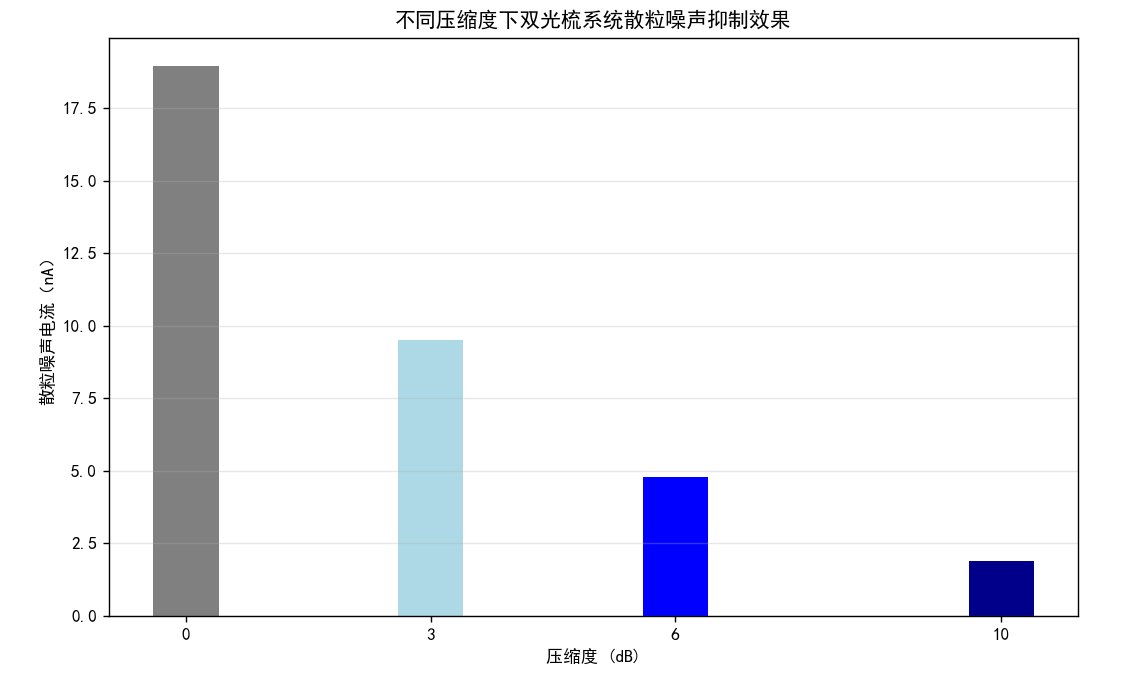 - 3dB 压缩后噪声抑制比 = 2 倍(对应 3dB,因为 10log₁₀(2)=3dB),6dB≈4 倍,10dB=10 倍,完全匹配 “压缩度 dB 值 = 10log₁₀(经典噪声 / 压缩后噪声)” 的理论公式,验证了压缩模块的正确性;