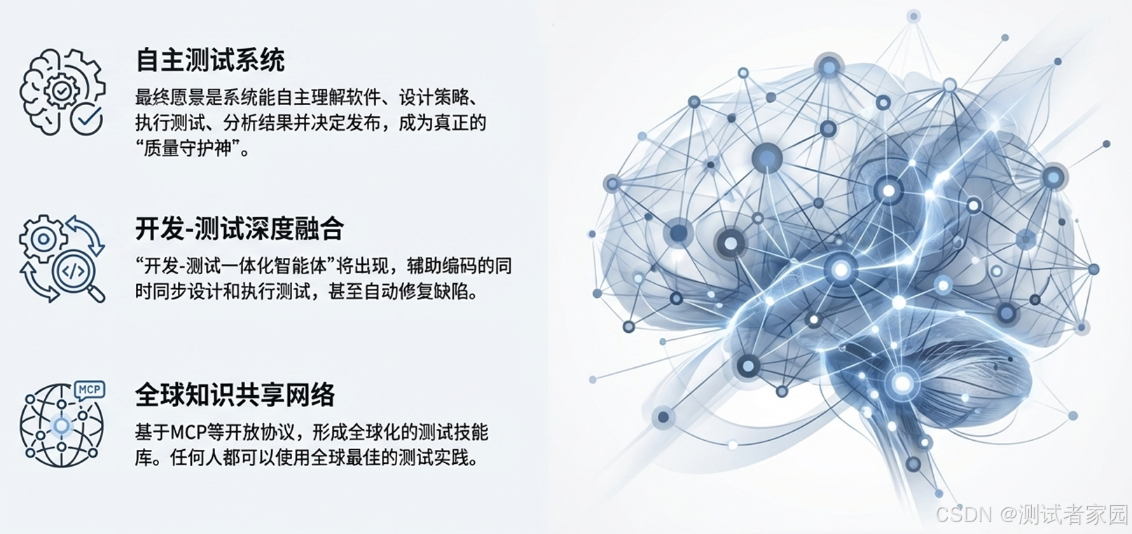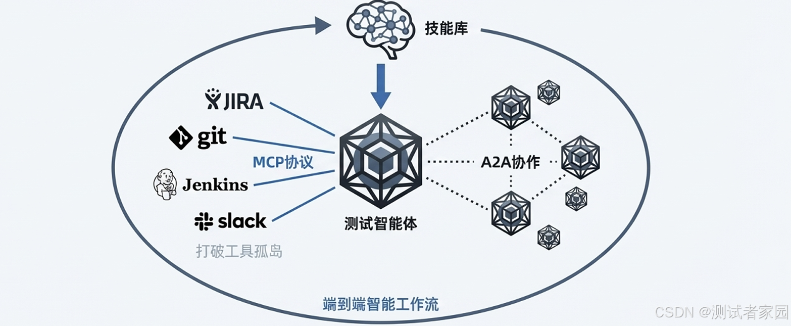 基于MCP等开放协议,未来可能形成全球化的测试知识共享网络。不同组织开发的测试技能、测试工具、测试数据集可以在标准协议下互通互联。