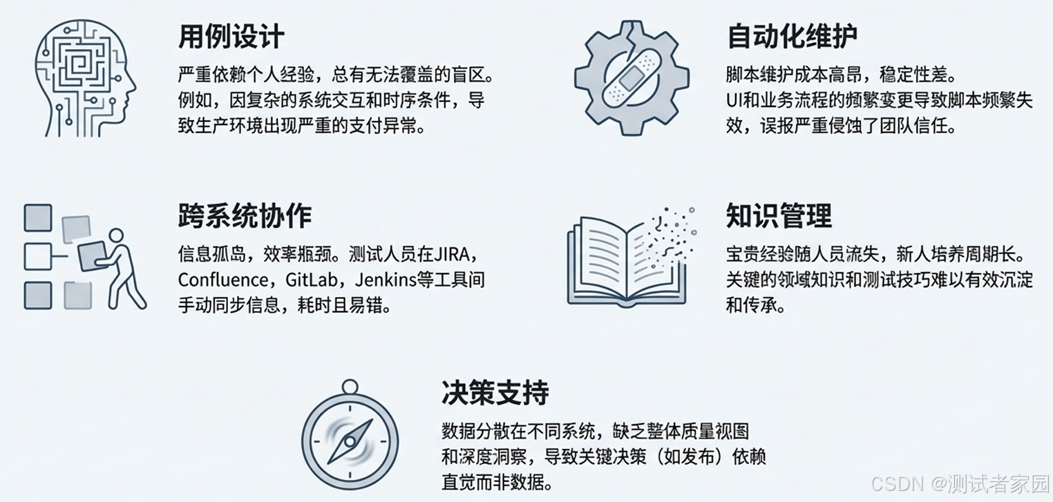 测试管理需要基于各种数据做出决策:应该重点测试哪些模块?需要投入多少测试资源?什么时候可以发布?这些决策传统上主要依赖测试负责人的经验和直觉,缺乏系统的数据支撑。