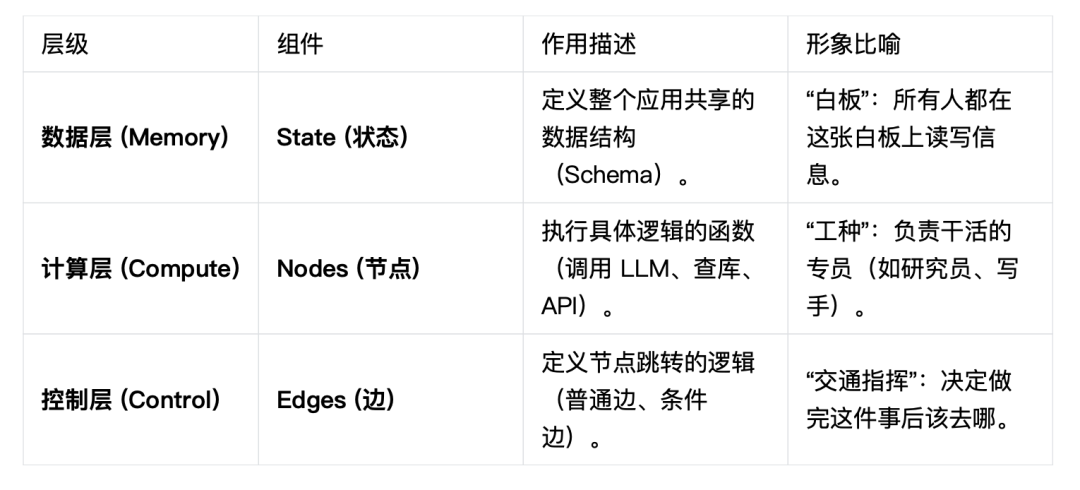 LangGraph 的架构可以被拆解为三个核心层级。其设计哲学深受 Google Pregel的分布式图计算思想和 NetworkX的图结构接口设计影响。前者提供了“像顶点一样思考”的迭代并行计算范式,后者则启发了 LangGraph 在图结构化建模和 API 设计上的简洁性与灵活性。