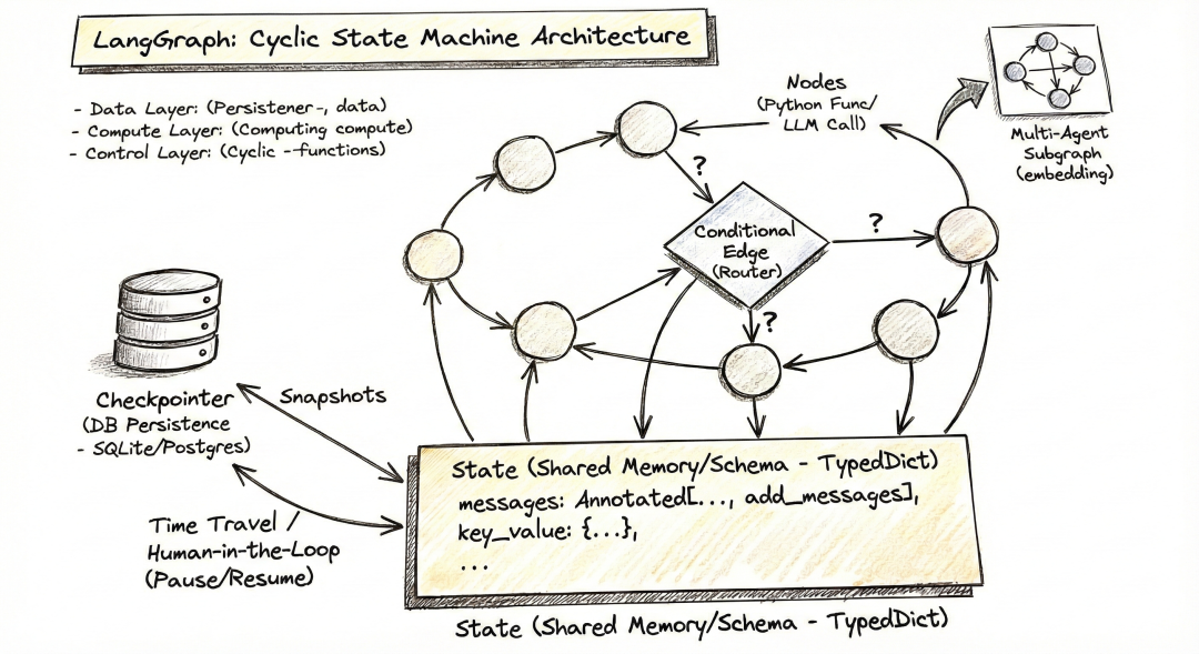 我们再看这个手绘架构图,可以对LangGraph 有一个更深入的理解,架构图生动地展示了 LangGraph **“循环(Cyclic)”**与 **“状态驱动(State-Driven)”**的核心本质。咱们进一步基于该图示对核心组件进行初步详解。