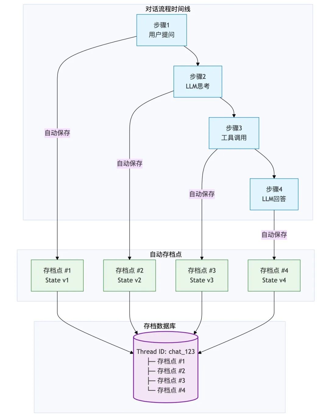 你可以把它理解为游戏的“自动存档”。图里的每一步操作(比如 LLM 刚说完话,或者工具刚查完数据),系统都会在后台默默地按一下 Save键。