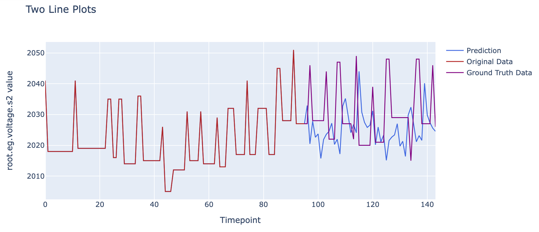 在该数据集上,IoTDB-ML的模型推理功能可以通过以往A相电压,B相电压和C相电压的数值和对应时间戳,预测未来一段时间内的C相电压,赋能变电站的监视管理。