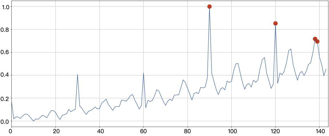 我们将检测为异常的结果进行绘制,可以得到以下图像。其中蓝色曲线为原时间序列,用红色点特殊标注的时间点为算法检测为异常的时间点。