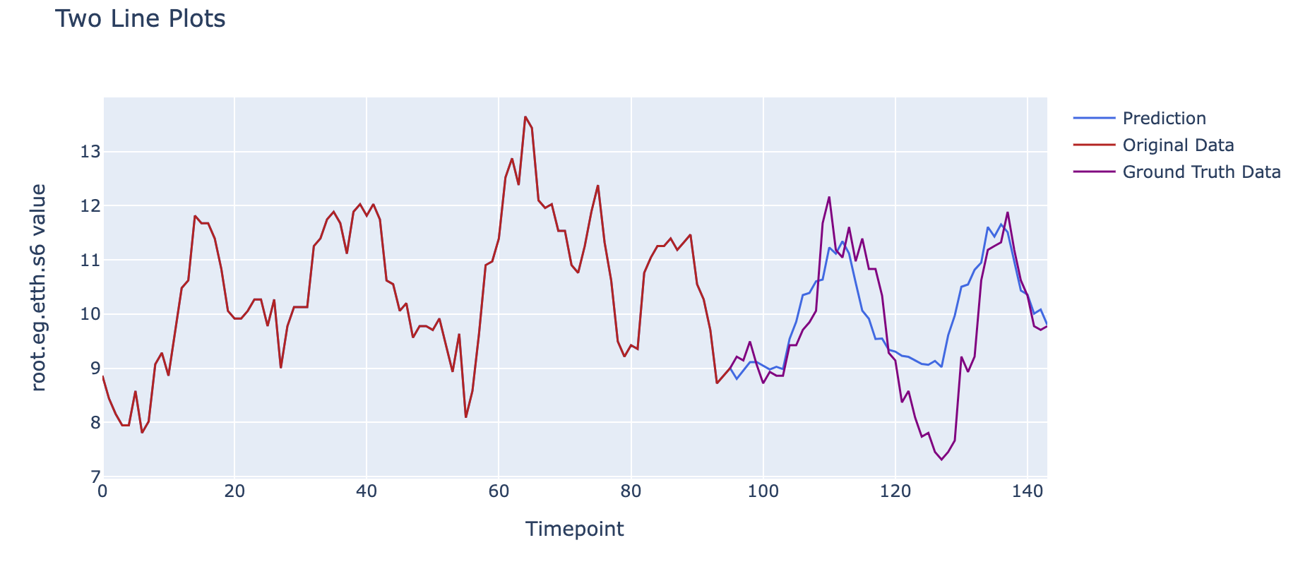 可以看到,我们使用了过去10分钟的电压的数据,基于之前学习到的序列间相互关系对未来5分钟的C相电压这一数据的可能变化进行了建模,可以看到可视化后预测曲线与实际结果在趋势上保持了一定的同步性。