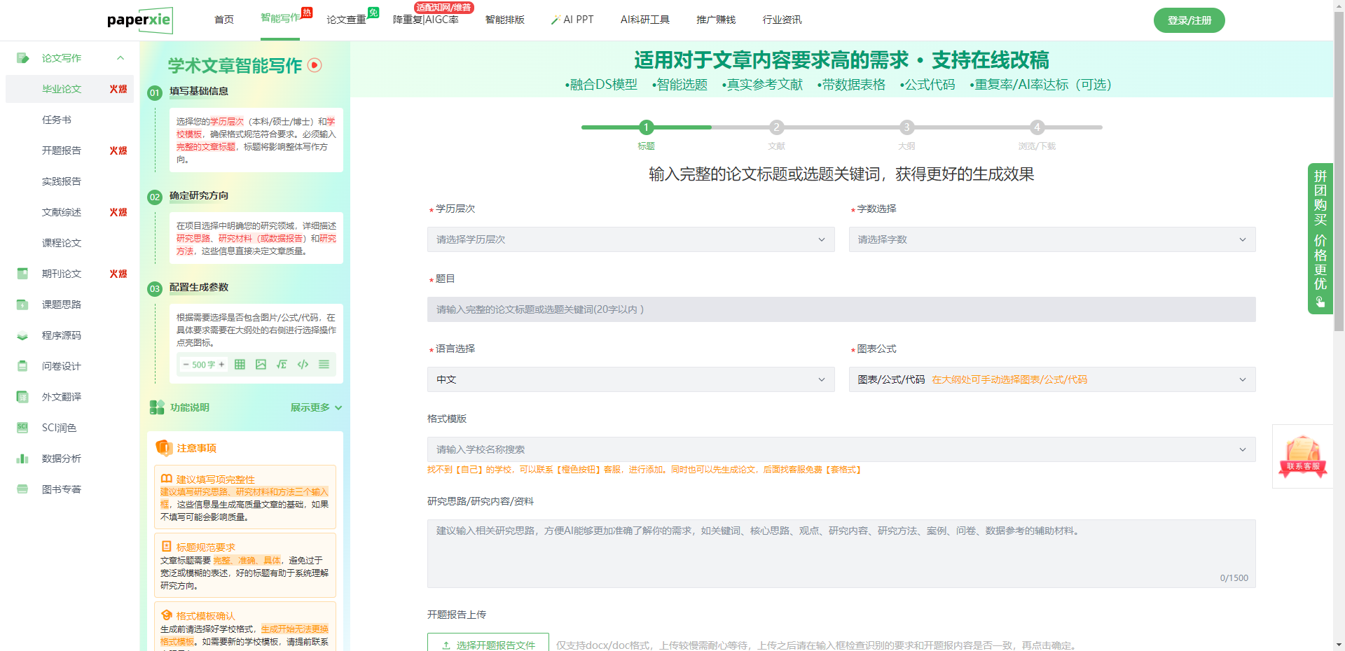 paperxie 的毕业论文功能,直接用融合 DS 模型的智能选题系统打破了这个僵局。在 “填写基础信息” 环节,你只需要选好学历层次(本科 / 硕士 / 博士)、输入初步的研究关键词,系统就能基于数据库里的真实文献、学科热点,生成既符合你学历要求,又自带创新点的选题方向 —— 比如你想研究 “乡村振兴中的电商模式”,系统会帮你细化到 “县域农产品直播电商的流量转化机制” 这类具体、可落地的题目,连文献综述的核心参考文献都能同步推荐。