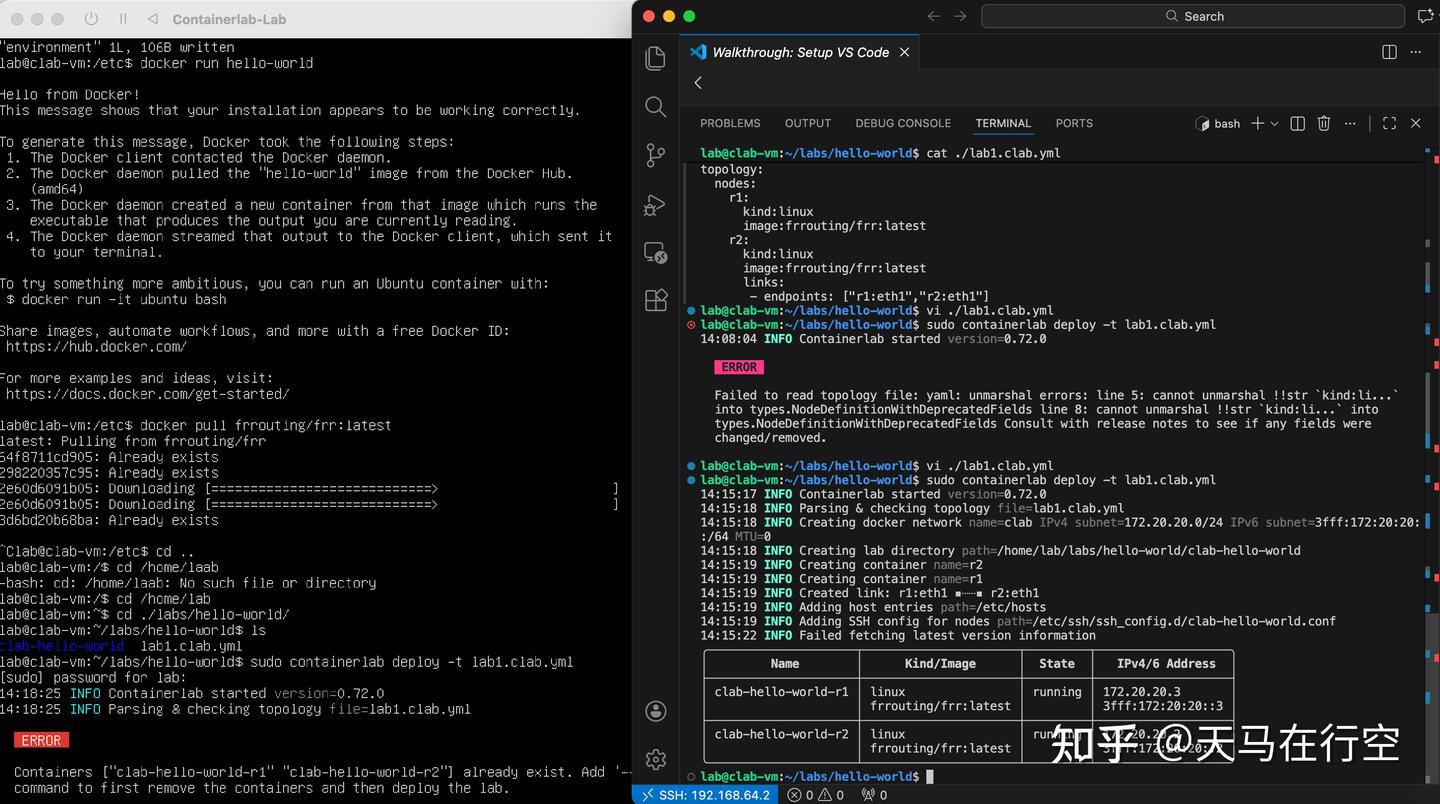 在 VS Code 的远程终端中,我们部署一个双节点拓扑验证成果。