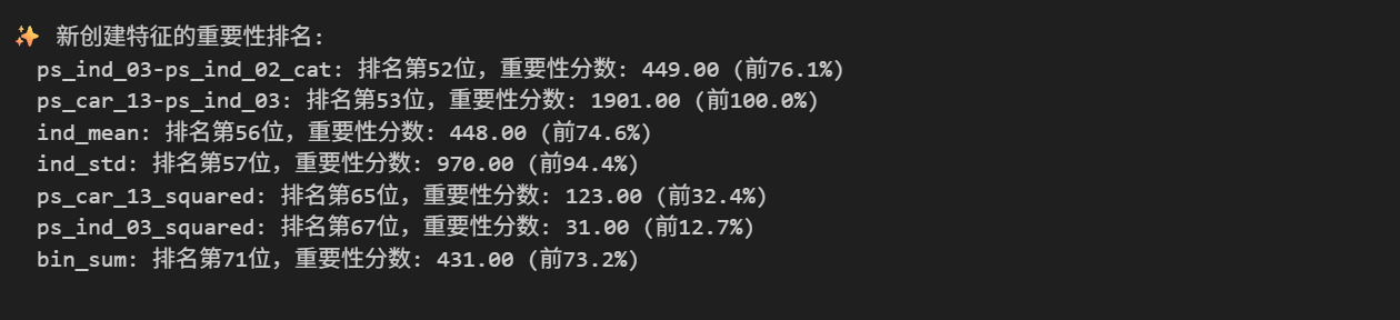 # 基于业务理解创建交互特征 train['ps_ind_03-ps_ind_02_cat'] = train['ps_ind_03'] * train['ps_ind_02_cat'] train['ps_car_13-ps_ind_03'] = train['ps_car_13'] * train['ps_ind_03'] -