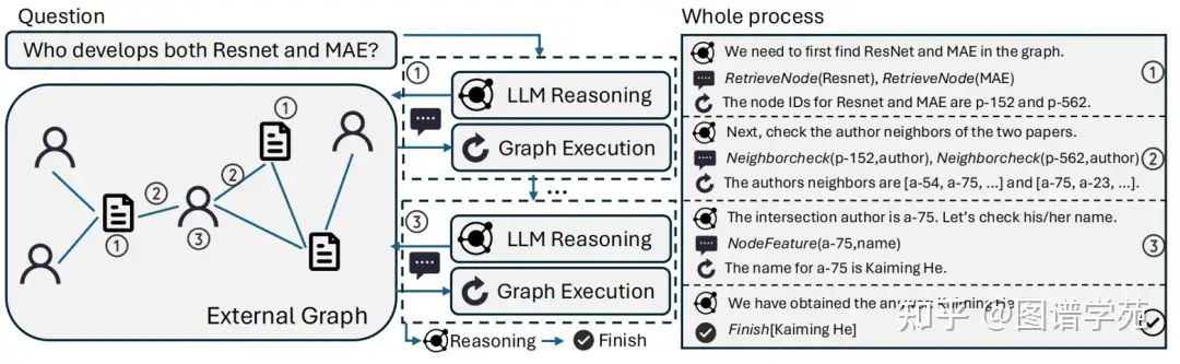 上述检索框架大部分都是基于实体关系匹配或路径匹配进行一次迭代检索,这可能会导致模型对图结构的推理理解不足——在图上的逐步游走推理降级为简单的信息匹配。为了使知识图谱与大模型迭代式多轮交互,论文[7]提出了一种名为图式思维链(GRAPH-COT)的简洁高效框架。其核心思想是让语言模型通过逐步遍历图结构来获取关键信息,而非直接将整个子图作为上下文输入(如下图所示)。GRAPH-COT采用迭代框架设计,每次迭代对应图结构中的一个步骤。每个迭代包含三个子步骤:1)推理阶段:语言模型根据现有信息提出可得出的结论,并确定图中需要补充的信息;2)交互阶段:语言模型生成从图中获取信息所需的交互操作(如查找节点、检查邻接关系等);3)执行阶段:将交互步骤中的请求在图结构中执行并返回对应信息。通过这种方式,语言模型能够在图结构上进行链式推理,精准捕捉关键信息。该过程将持续迭代,直至语言模型在推理子步骤中得出最终答案。