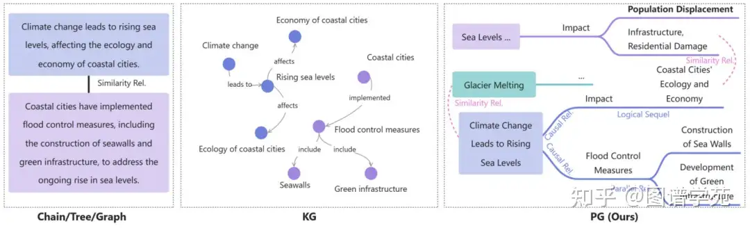为了解决有限的检索粒度问题(Chain/Tree/Graph-RAG通常使用固定的粒度)和限制关系问题(而知识图谱中的关系需要严格定义),论文[3]提出名为伪图检索增强生成(PG-RAG)的预检索框架,通过为LLM提供海量原始阅读材料,并鼓励其自主阅读以用个人语言记录事实信息,将LLM拟人化为学习者。由此产生的简明有序思维索引通过共同主题或互补事实相互关联,形成如下图所示的伪图数据库。