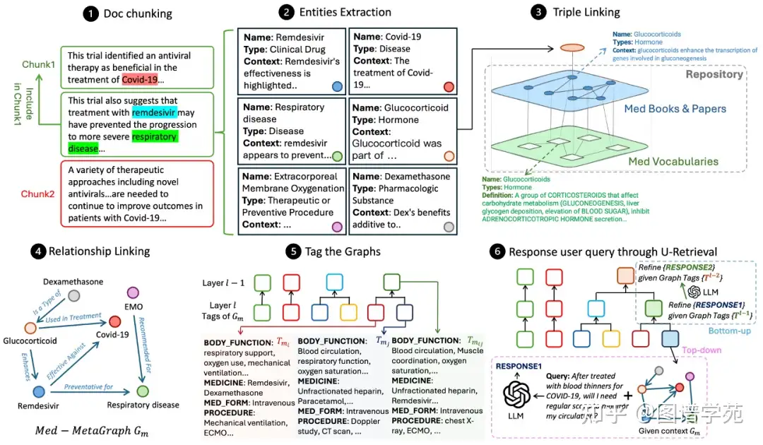 作为一种图索引数据检索和图附带知识建模的融合方法,论文[4]提出了一种专为医疗领域设计的新型图谱增强生成框架——MedGraphRAG,旨在提升LLM生成循证医学响应的能力,从而在处理私人医疗数据时增强安全性和可靠性。为拓展GraphRAG在医疗领域的应用能力,MedGraphRAG提出了独特的三元图构建技术和U检索技术。在图结构构建过程中,MedGraphRAG采用三重链接架构将用户文档与权威医疗资源及受控术语库相连接。检索流程中,MedGraphRAG提出U-Retrieval算法,该方案融合自上而下的精准检索与自下而上的响应优化机制,在全局语境感知与精准索引之间取得平衡。这种双重策略既实现了医疗信息检索,又确保了完整回答生成。如下图所示,该方法通过5个步骤构建出三层知识图谱结构: