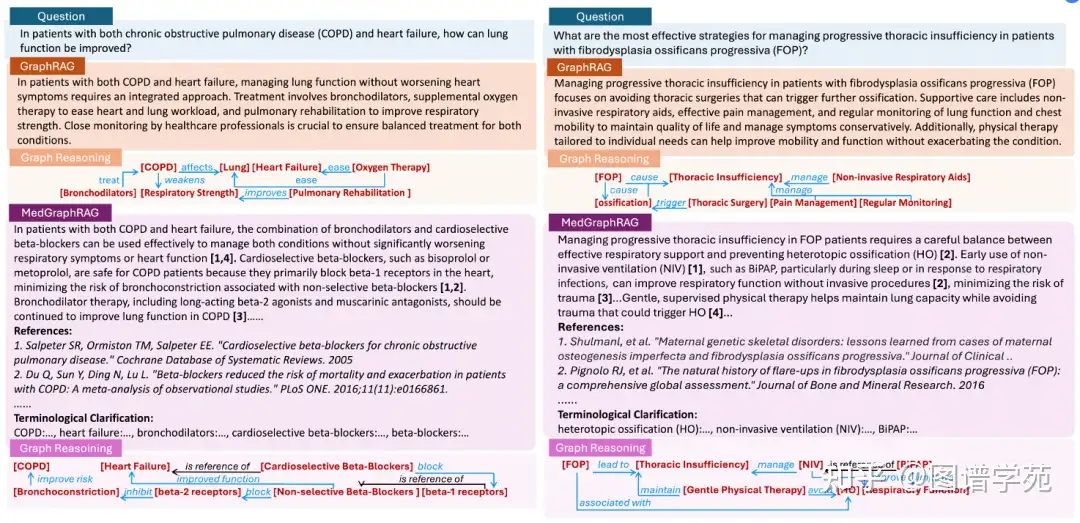 通过该方法组织出的三层次知识图谱可以提供较为可靠的循证方案,以下是GraphRAG和MedGraphRAG的示例响应,其中包含抽象化图表。MedGraphRAG能提供更详细的解释,并结合证据进行更复杂的推理。