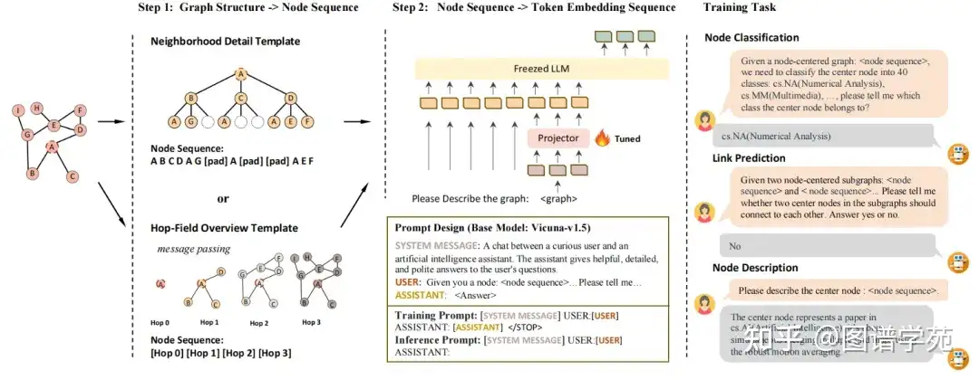 这里的微调技术方法与传统的指令微调或监督学习微调相似,但目的不同——GraphRAG中对LLM的微调主要是为了让LLM能够理解图结构、生成知识图谱中相关推理路径或对LLM生成过程中附加知识图谱约束等。为了有效编码图结构信息以适应不同任务和领域同时使大型语言模型(LLMs)能够理解,,论文[8]推出了大型语言与图助理(LLaGA)这一创新框架,它能将丰富的图结构数据与大型语言模型强大的上下文感知能力和理解能力无缝整合。整体框架如下图所示。