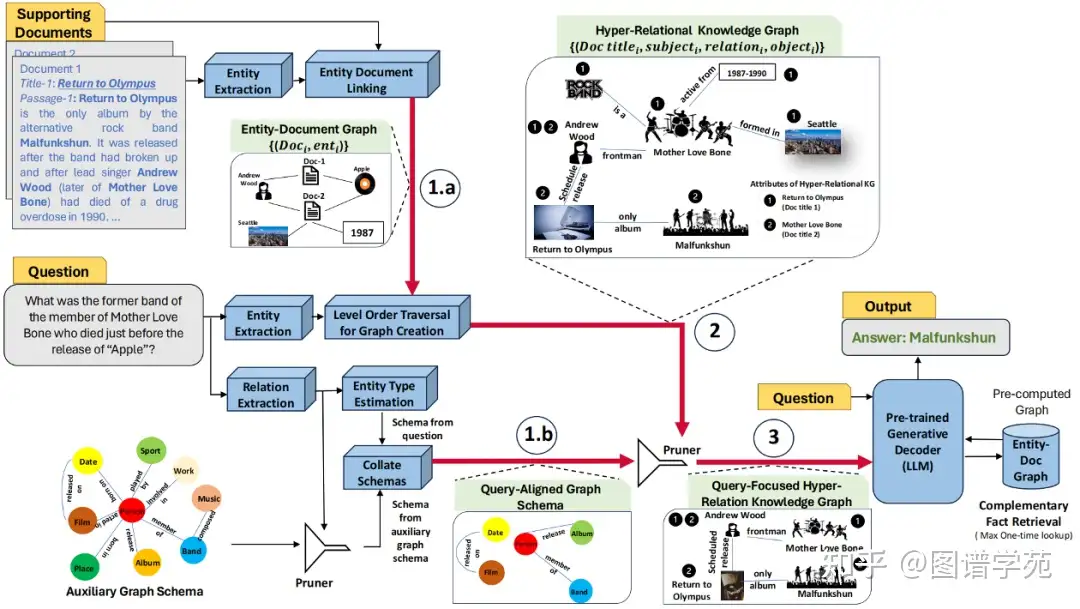 GraphRAG的大部分研究通过从原始文本中提取知识图谱三元组,并结合思维链推理来实现。然而,这些提取的知识图谱三元组既不依赖于查询内容,也缺乏事实成立的上下文依据。要理解这种因缺乏上下文导致的歧义,可以考虑这个知识图谱三元组:{主语:“苹果”,关系:“价格上涨”,宾语:“10%”}。若没有额外上下文,很难判断“苹果”这个实体指的是水果还是公司。此外,结构化问答方法会将提取的知识图谱三元组和原始文本同时输入到大模型中,导致提示词显著冗长(见表3)并产生信息重复。研究[6]提出HOLMES方法,通过创建以查询为中心的上下文感知知识图谱,并将其作为大模型的唯一输入(即不输入原始文本),有效解决了这些问题。具体来说,该方法首先从非结构化文本中构建超关系知识图谱,既捕捉事实本身,又记录其存在的背景语境;然后利用知识框架对超关系知识图谱进行优化,通过编码解答查询所需的信息类型。这两个步骤共同为语言模型提供经过筛选的相关事实集合。如图下图所示,本文以HotpotQA数据集为例对进行了HOLMES案例分析。