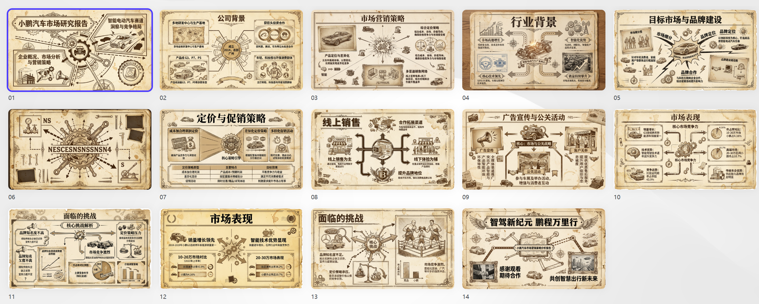 - 主题生成:直接输入想法(如“新能源汽车市场分析报告”),选择“创意绘图PPT”AI将自动生成全套可编辑PPT。