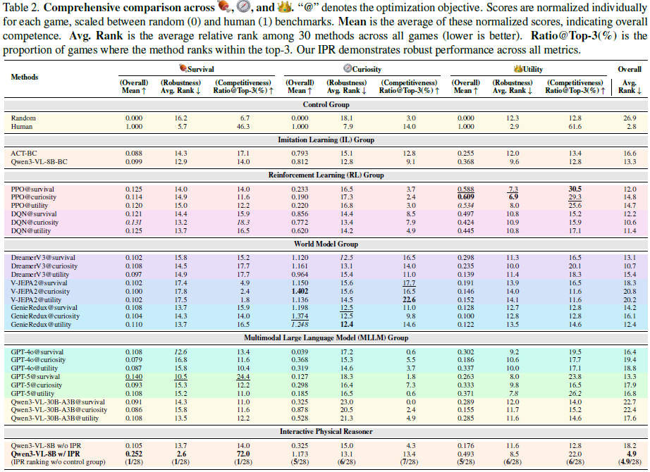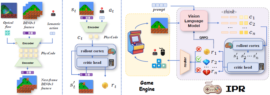 IPR 是一种通过将以物理为中心的潜在动作空间与预测引导的 VLM 优化相结合来用预测强化物理推理的范式,使得物理和因果规律直接从交互后果中提炼,而非来自静态语料库。IPR 相较于基于 VLM、基于预测和基于强化学习的基线都产生了稳健的增益,并显示出对未见游戏的强大零样本迁移能力。