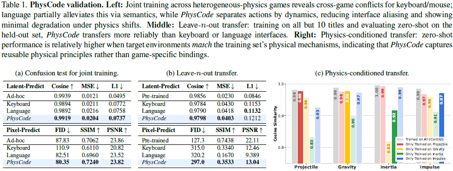 2)测试迁移:在源游戏上学习的共享 PhysCode 在具有匹配物理的未见环境中提高了零样本性能,证明了真正的物理基础,而非接口记忆。