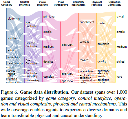 - 在整个 1000+ 游戏语料库中,以 60 FPS 记录每个游戏 4 分钟的人类游戏过程,并获得每款游戏的注释,涵盖物理原理、因果机制、动作语义 和 游戏指令。