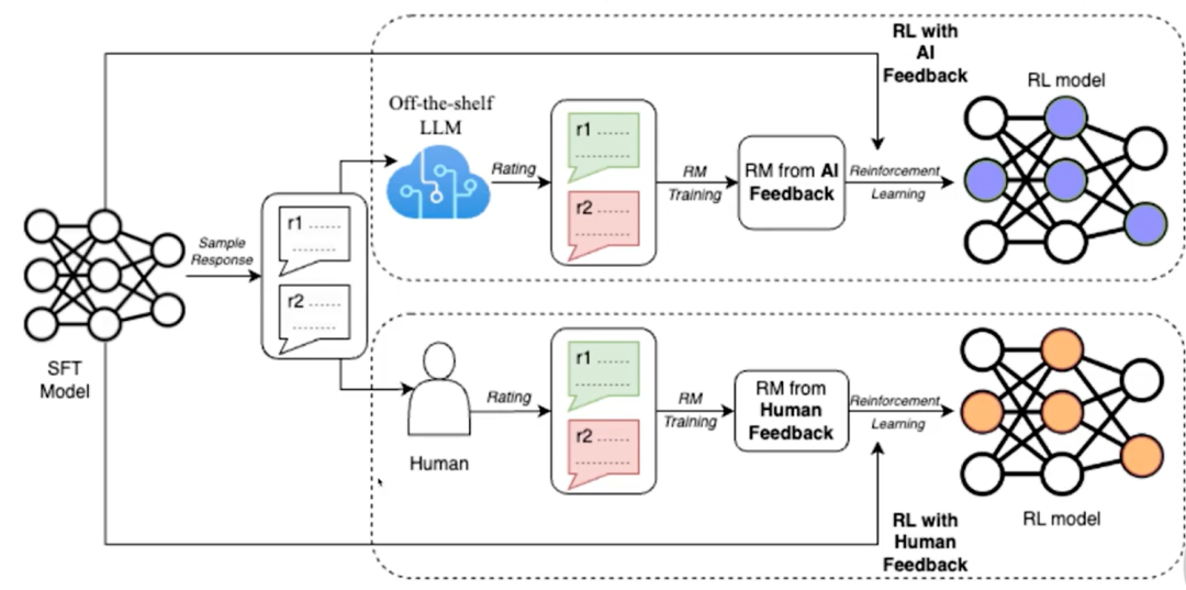 直接利用LLM反馈:通过直接提示LLM获取奖励分数,RLAIF绕过了将LLM偏好标签提炼成奖励模型的步骤,这种方法在某些情况下比传统的RLHF设置更有效。