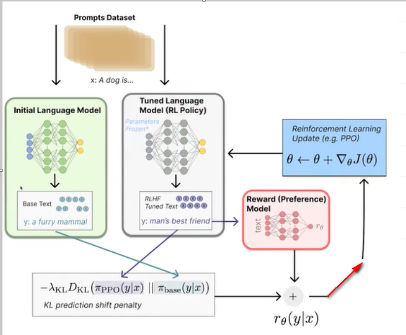 λ_KL * D_KL(π_PPO(y|x) || π_base(y|x))。 D_KL(...):衡量的是当前策略π_PPO和初始基线模型π_base的输出分布之间的差异。如果差异过大,就会被惩罚。λ_KL:是一个超参数,用于控制惩罚的力度。- 作用:这个惩罚项像一根“缰绳”,确保模型在追求高奖励的同时,不会偏离它从预训练和SFT中学到的基本语言知识和常识太远,从而保证输出的文本既符合偏好,又保持连贯和合理。