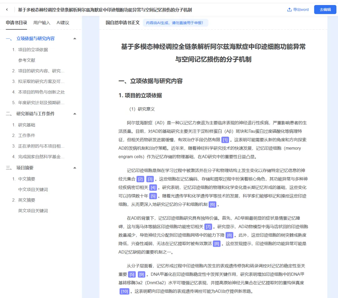 - AI生成高质量逻辑初稿:在明确了方向、夯实了文献基础后,最关键的一步到来。工具可以一键生成完整的申请书正文。它并非简单拼凑,而是根据你之前输入和确认的所有信息(优化后的标题、研究思路、参考文献、研究基础等),按照基金委的规范要求,自动撰写各部分内容,形成一份逻辑通顺、引用规范、要素齐全的初稿。这份初稿为你提供了一个极高的起点,你可以直接导出为Word文档,在此基础上进行属于你自己的、画龙点睛的深度修改和特色强化。