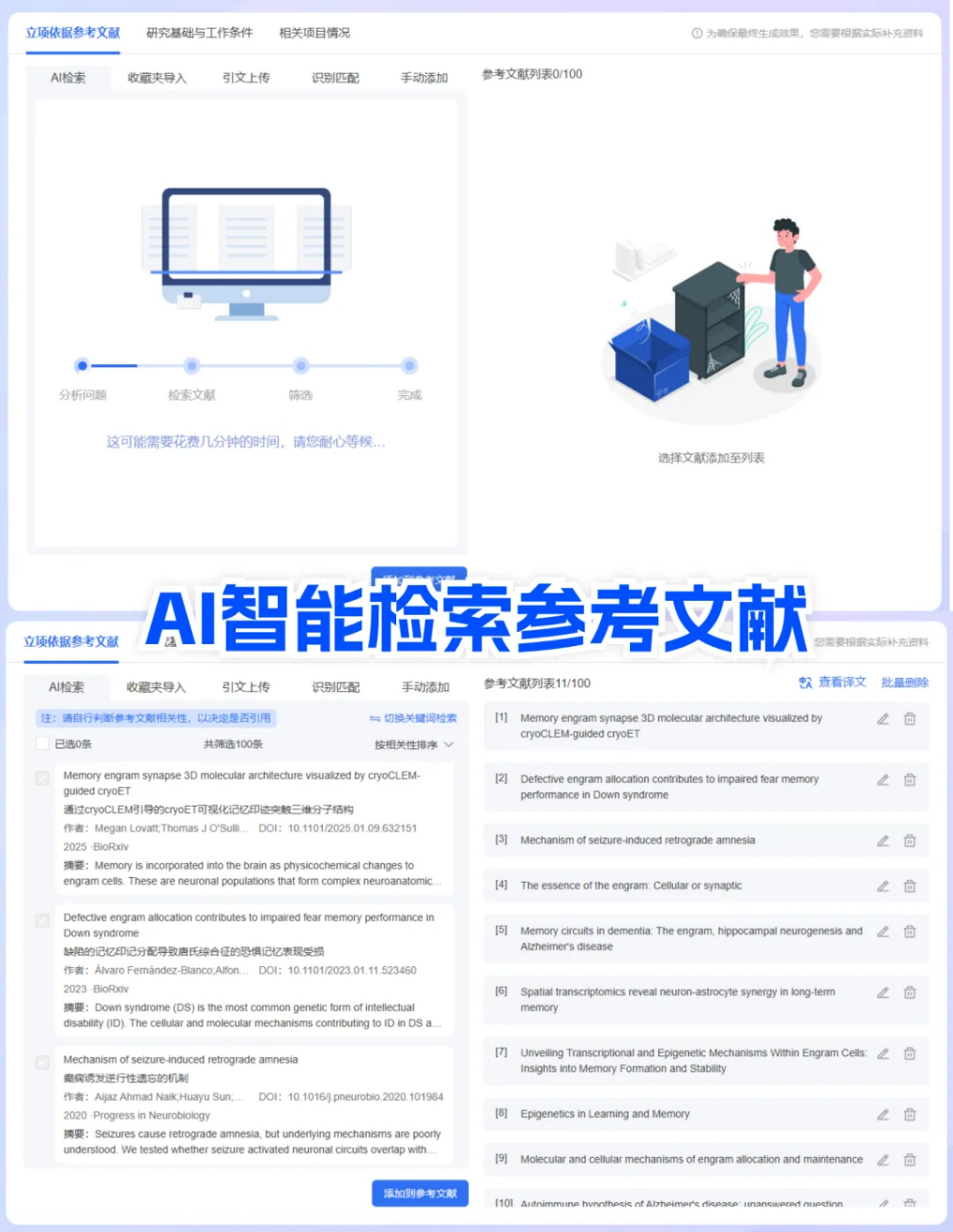 - 文献精准推荐与整合:扎实的立项依据离不开高相关度的文献。「AI国自然申请书」提供了多达5种的文献添加方式。其AI智能检索功能尤其强大,能直接解析你的研究主题,自动生成检索式,从海量数据库中精准抓取近十年的核心文献,并支持查看摘要与全文。同时,你还可以便捷地导入已有文献库(如EndNote)、通过DOI/PMID精准匹配或手动补充。这确保了申请书中的每一处引用都真实、相关、前沿,构建起坚实可信的论证基础。