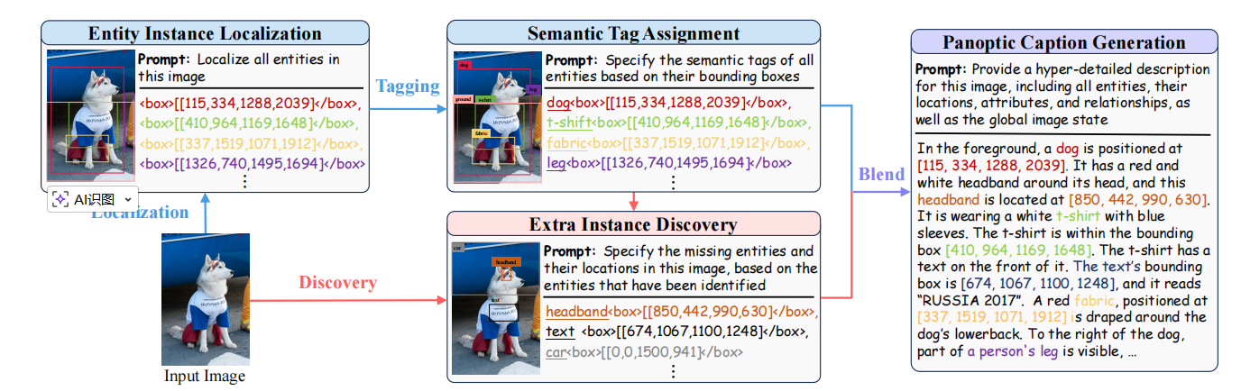 基于图像中检测到的实体实例,构建实体感知的提示,并指导MLLMs生成全景式字幕。