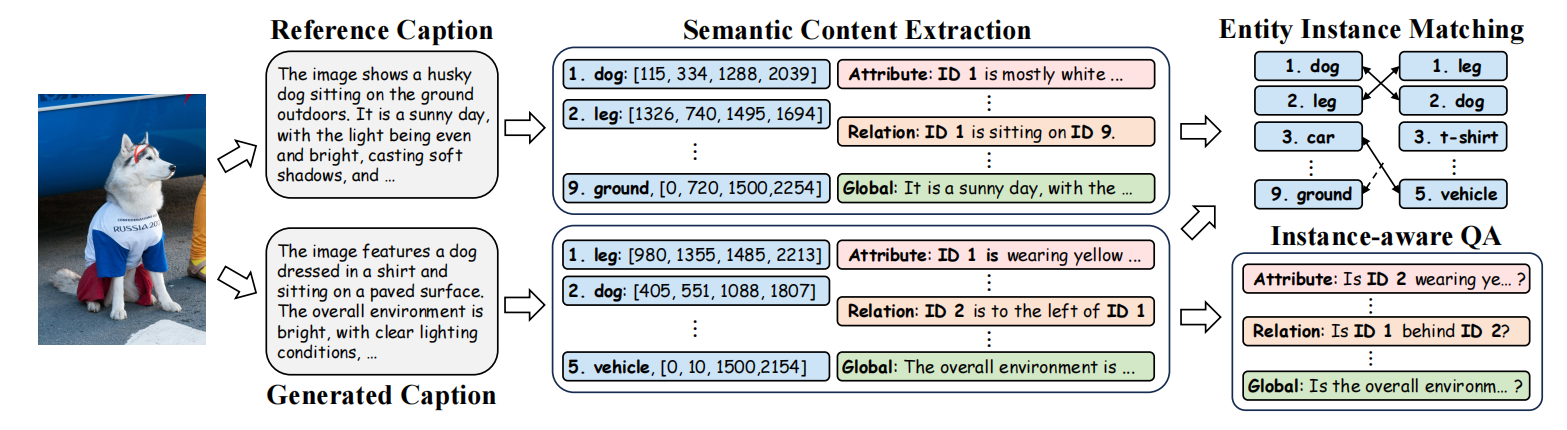给定一张图片,PancapScore使用真实字幕作为参考,评估生成的全景标题的质量。首先从标题中提取所有语义内容,并将它们分为五个维度。基于提取的语义内容,PancapScore通过实体实例匹配来评估语义标签和实例定位。然后,PancapScore以问答的方式评估属性、关系和全局状态,并最终综合考虑所有五个维度获得总分。