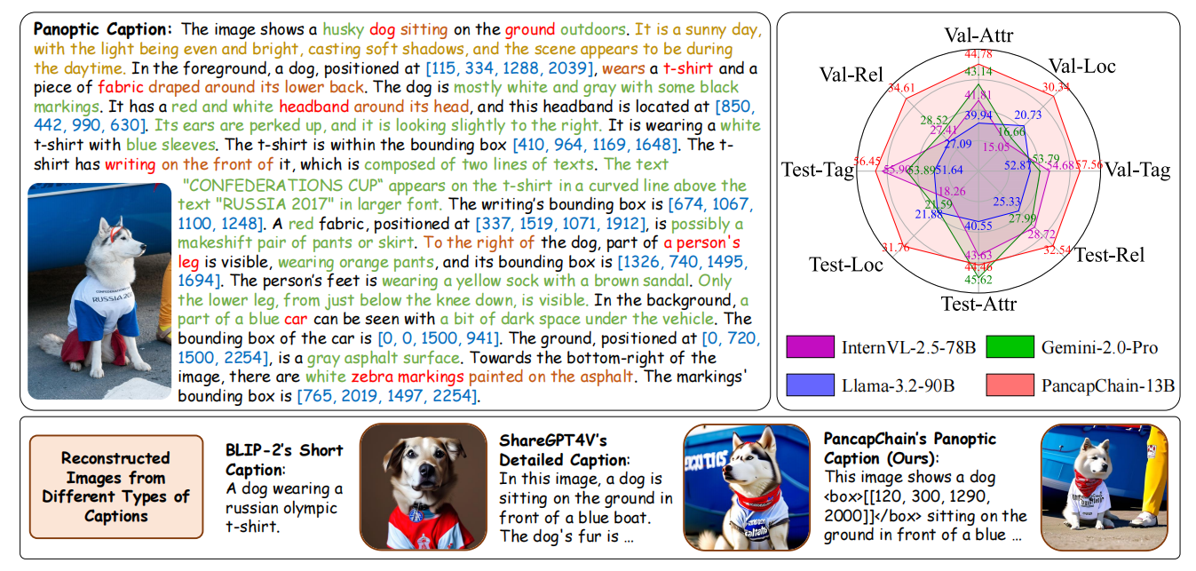 将全景字幕任务表述为生成一个全面的文本描述(见上图左上角),全面性捕捉基本语义元素(例如,中心的狗),同时为了简洁性排除不太关键或微妙的细节(例如,地面上的微小颗粒)。