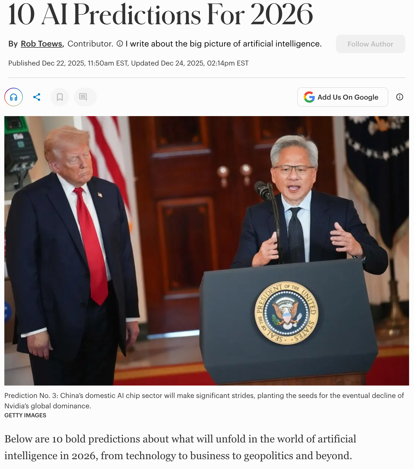 2026年AI领域十大预测:1)Anthropic将上市而OpenAI不会;2)苏茨克维尔的SSI技术将泄露,迫使各大实验室调整研究方向;3)中国国产AI芯片突破将动摇英伟达主导地位;4)AGI讨论热度将显著降温;5)AI芯片折旧计提表将成为关键财务指标;6)更多企业将自研定制芯片;7)阿尔特曼将卸任OpenAI CEO;8)AI将成为美国中期选举核心议题;9)大型药企将收购蛋白质AI初创公司;1