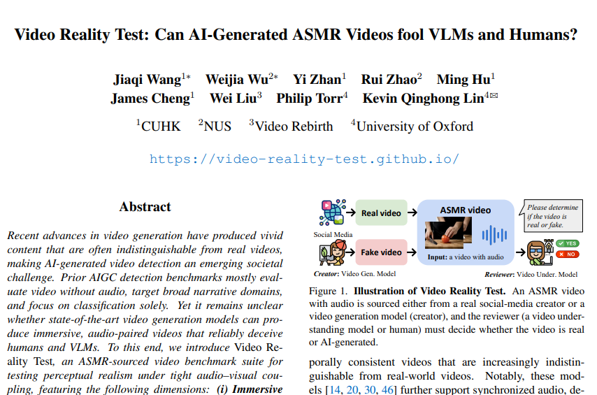 A:Video Reality Test是由香港中文大学等研究机构开发的AI视频真假检测测试平台,专门用来测试AI生成视频和检测系统的能力。它使用149个精选的真实ASMR视频作为标准,让AI视频生成模型扮演"创作者"制作假视频,AI检测模型扮演"审查员"识别真假,通过这种对抗方式评估双方的技术水平。