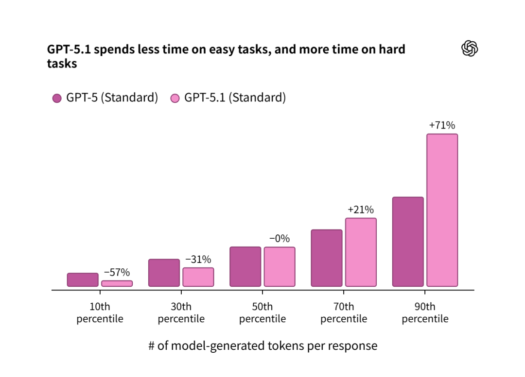 与 Instant 侧重速度不同,GPT-5.1 Thinking 是 OpenAI 面向复杂任务推出的深思型模型。它的更新重点在于推理策略的改进:根据任务难度动态分配思考时间。
