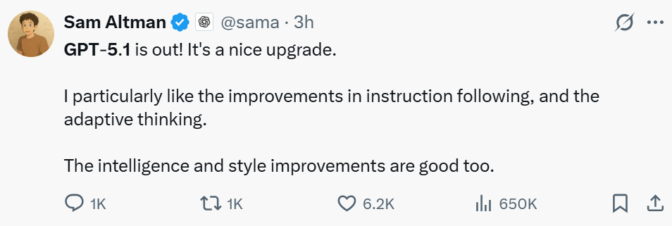 Sam Altman 在社交平台上说:这是一次不错的模型升级。