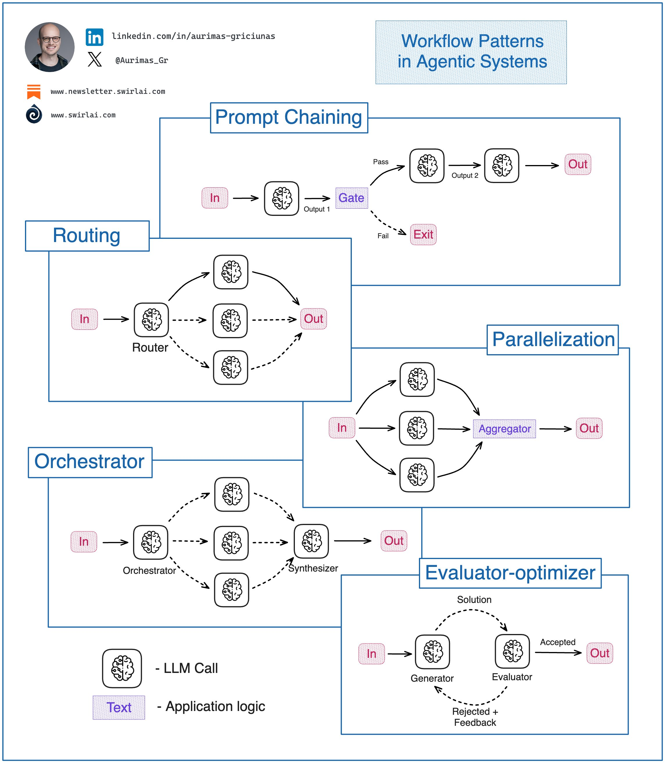You must know these 𝗔𝗴𝗲𝗻𝘁𝗶𝗰 𝗦𝘆𝘀𝘁𝗲𝗺 𝗪𝗼𝗿𝗸𝗳𝗹𝗼𝘄 𝗣𝗮𝘁𝘁𝗲𝗿𝗻𝘀 as an 𝗔𝗜 𝗘𝗻𝗴𝗶𝗻𝗲𝗲𝗿. If you are building Agentic Systems in an Enterprise setting you will soon discover that the simplest workflow patterns work the best and bring the most business value. At the end of last year Anthropic did a great job summarising the top patterns for these workflows and they still hold strong. Let’s explore what they are and where each can be useful: 𝟭. 𝗣𝗿𝗼𝗺𝗽𝘁 𝗖𝗵𝗮𝗶𝗻𝗶𝗻𝗴: This pattern decomposes a complex task and tries to solve it in manageable pieces by chaining them together. Output of one LLM call becomes an input to another.