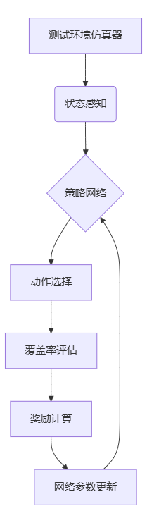 奖励函数(R):覆盖率提升值 + 缺陷发现率 × 风险系数