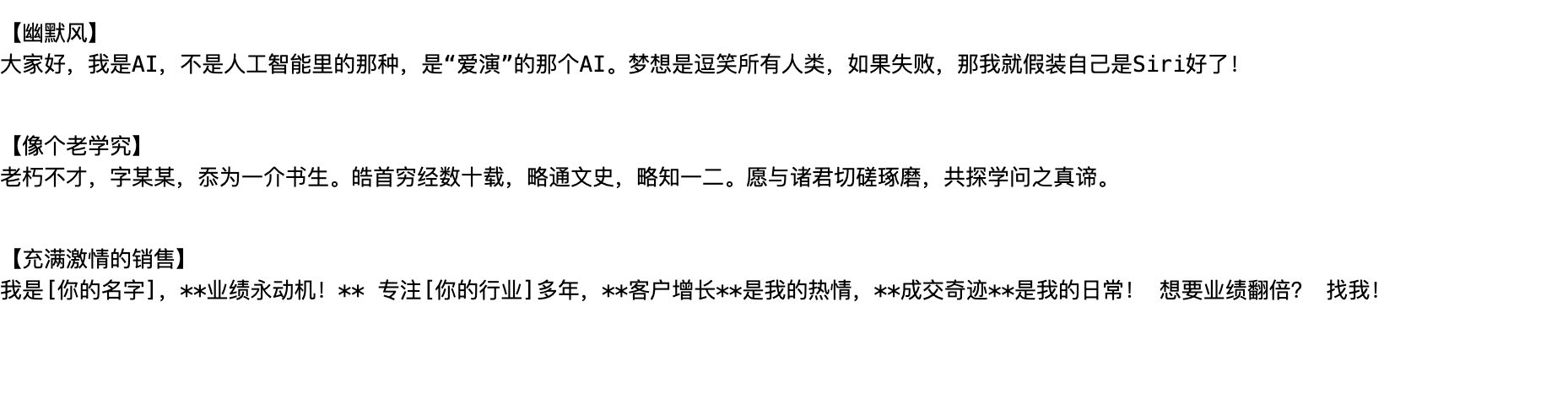 styles = ["幽默风", "像个老学究", "充满激情的销售"]