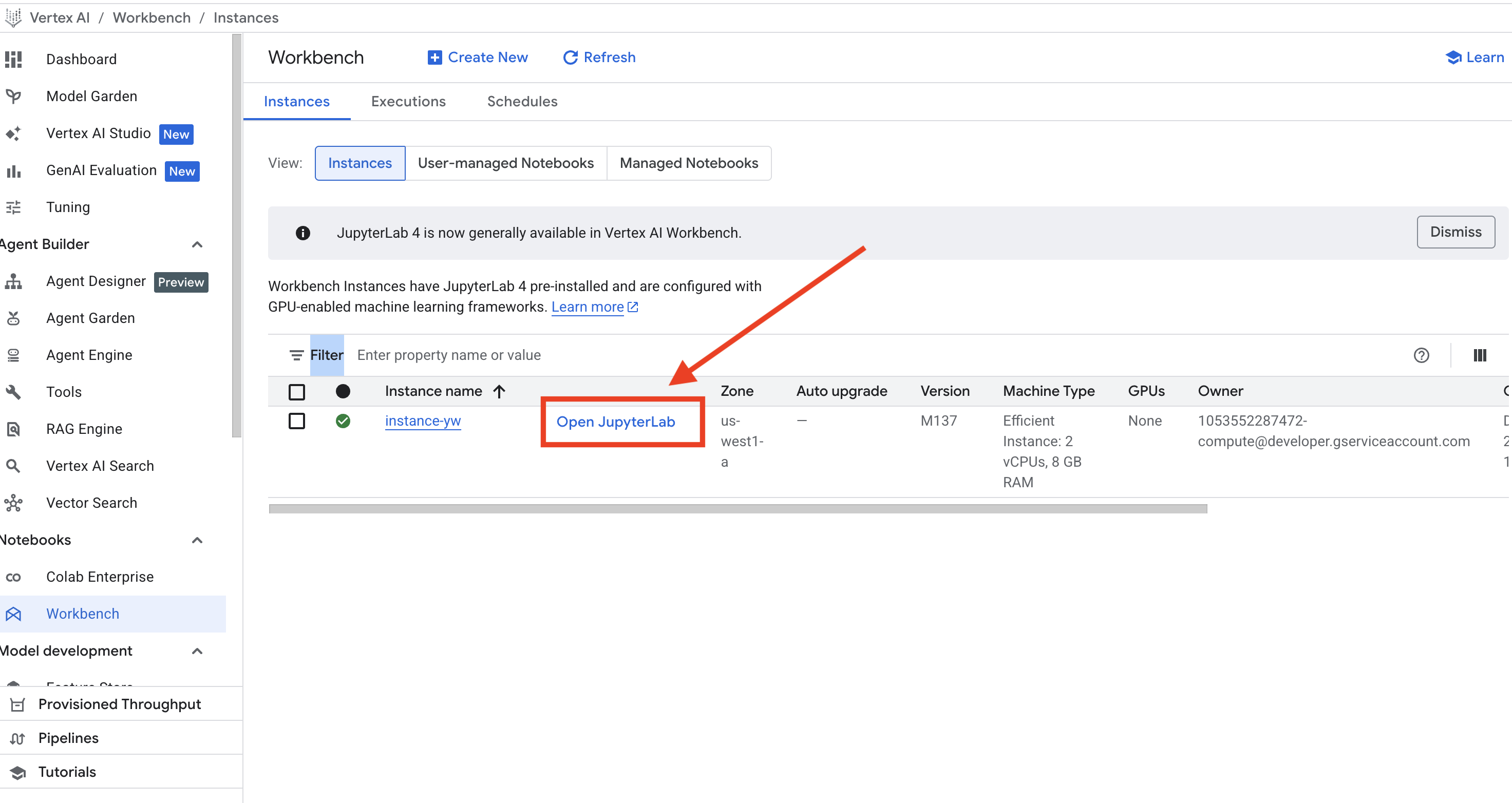 创建完 VM 后,稍等片刻,Workbench 页面会显示你刚创建的 VM,并且在 VM 名称旁边会出现蓝色的 Open JupyterLab 字样。点击进入 Open JupyterLab。如下图: