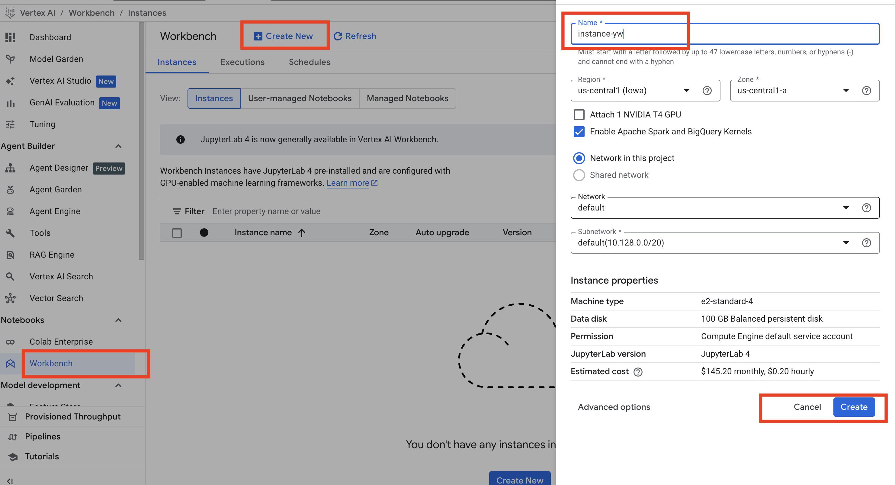 在 Google Cloud Console 中,选择 Vertex AI,然后在左侧导航栏点击 Notebooks 下的 Workbench。进入页面后,点击蓝色的 Create new 按钮,输入你的 VM 名称,然后点击 Create。如下图: