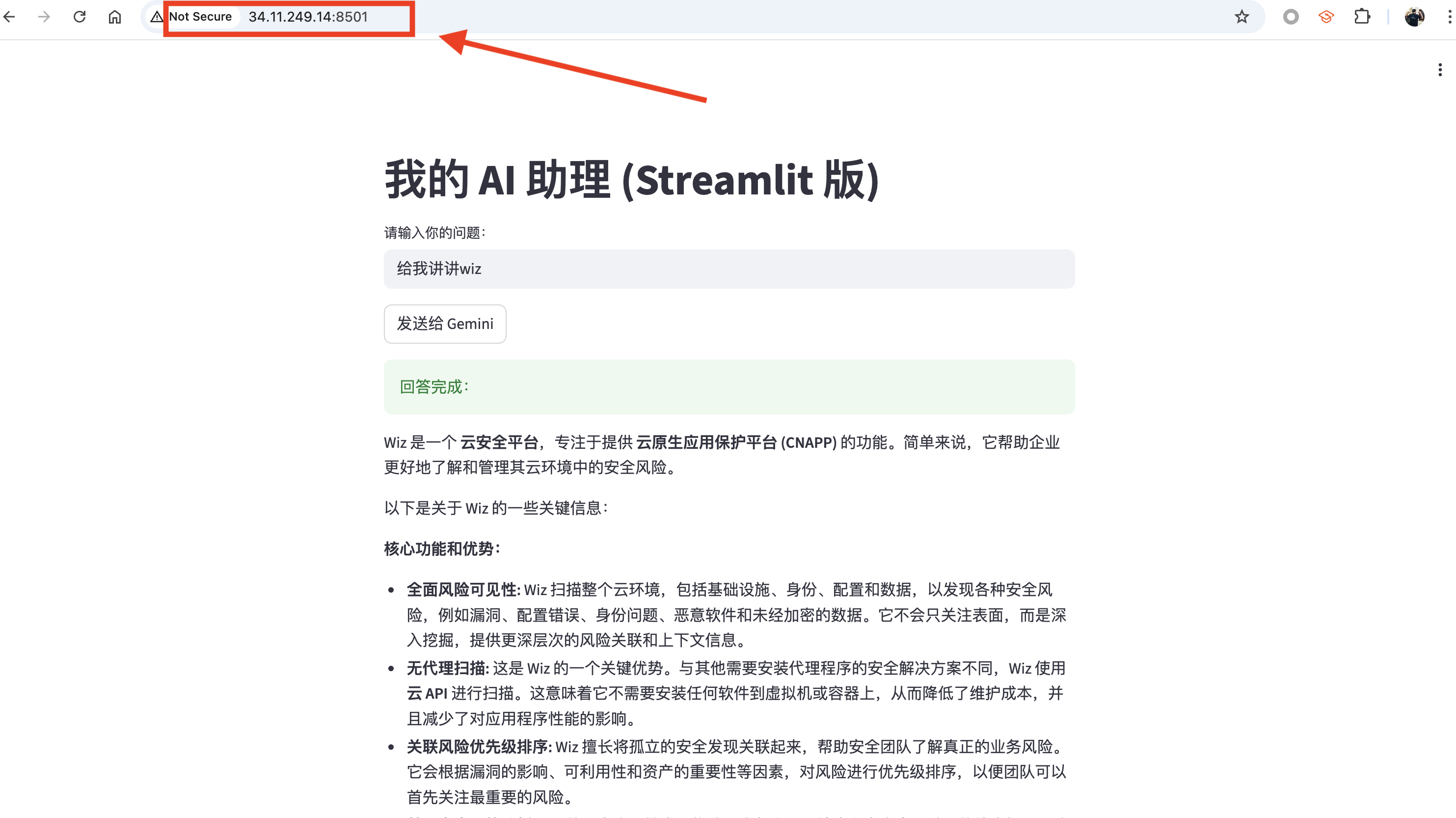 至此,一个基于 Gemini-2.0-Flash 的自托管 LLM 服务即部署完成。任何人都可以通过对应 IP 地址和端口访问该服务,访问效果如下:
