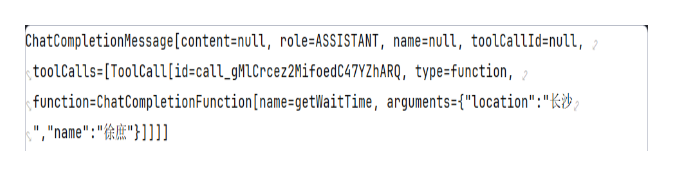 - this.doChatCompletion(request); 方法会正常请求chat completion 接口并且会带上funcation-call参数并携带tools属性 , 并且返回对话中的funcation-call所需参数(即WaitTimeService.Request的参数)