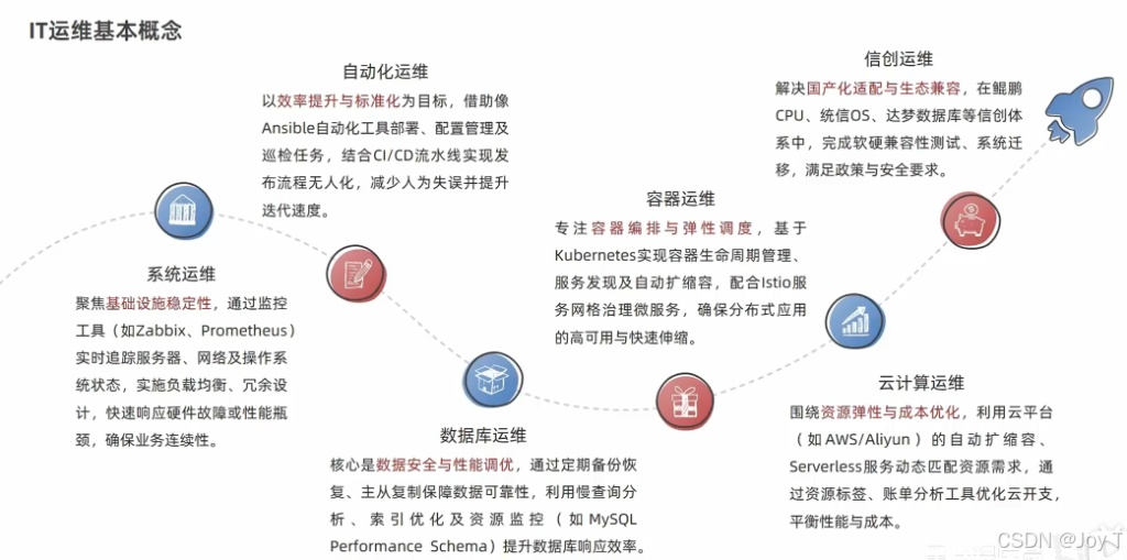 容器与信创运维:在云原生时代,容器运维专注于 Kubernetes 集群的生命周期管理,配合 Istio 服务网格治理微服务,确保分布式架构的高可用。同时,信创运维致力于国产化适配,在鲲鹏 CPU、统信 OS 等信创体系中完成软硬件兼容性测试与系统迁移。